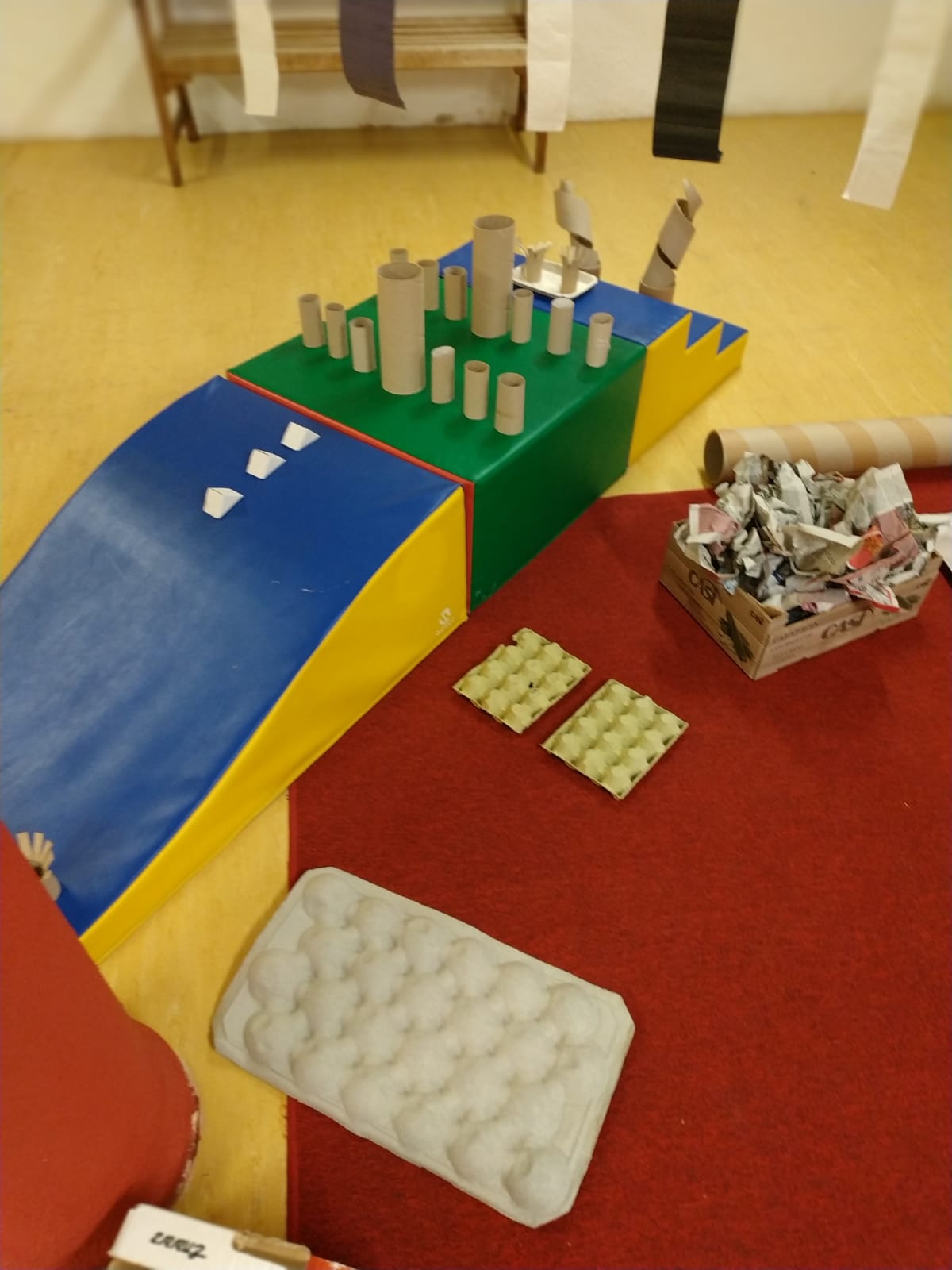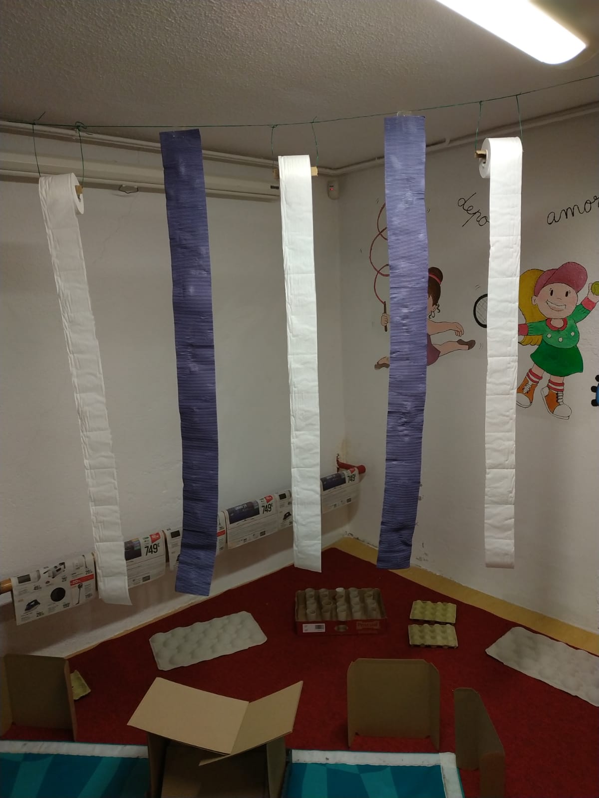 En esta ocasión, los alumnos han trabajado en una instalación artística inspirada en la teoría de Javier Abad, con materiales de papel reciclados, como rollos de wc, tiras de periódicos, papel continuo usado…etc.